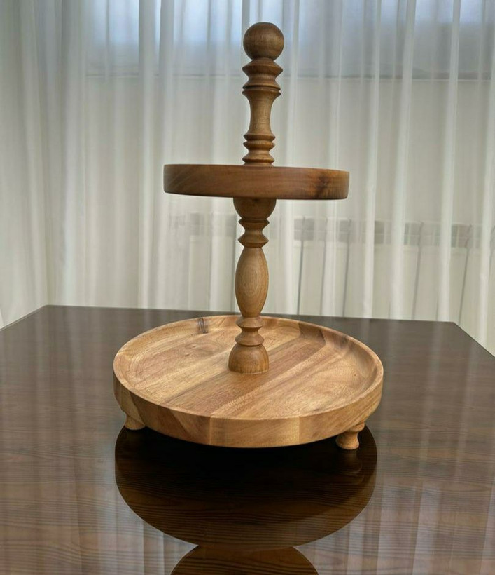 شیرینی خوری دو طبقه پایه خراطی که تماما از چوب گردوی درجه 1 ساخته شده و دارای پوشش روغن گیاهی آبگریز می باشد