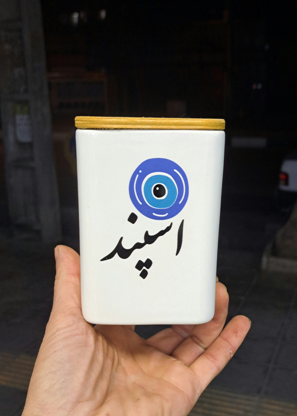 ظرف جا اسپندی سرامیکی مناسب برای نگهداری اسپند دارای درب چوبی که درز مخصوص برای اسپند دودکن داره